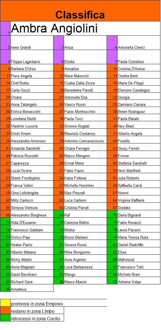 | I primi di ogni girone accedono alla zona Empireo di questa edizione. I secondi classificati di tutti i gironi vengono eliminati. |