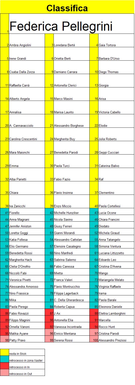 | Csaba Dalla Zorza 287 | Federica Pellegrini 287 | Marco Masini 287 | Csaba Dalla Zorza 298 | Ambra Angiolini 300 | Damiano Carrara 298 | Loredana Bertè 311 |