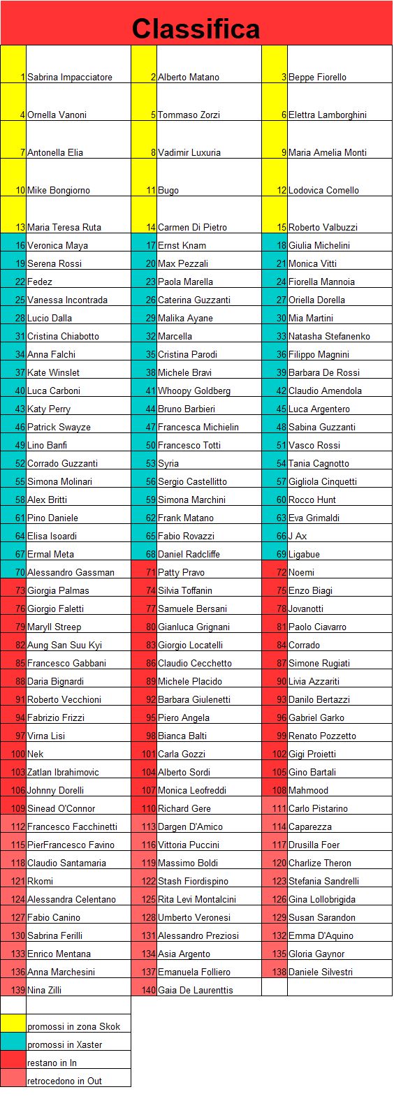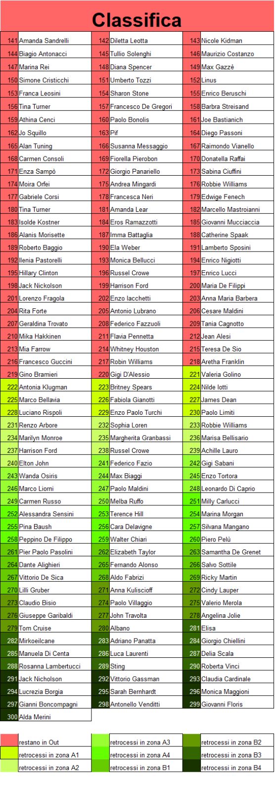 | superiore e vengono retrocessi i diecii personaggi con meno punteggio nel girone inferiore. Eccezione fanno le due estremità. Nell’ultimo girone vengono eliminati gli ultimi | ||||||