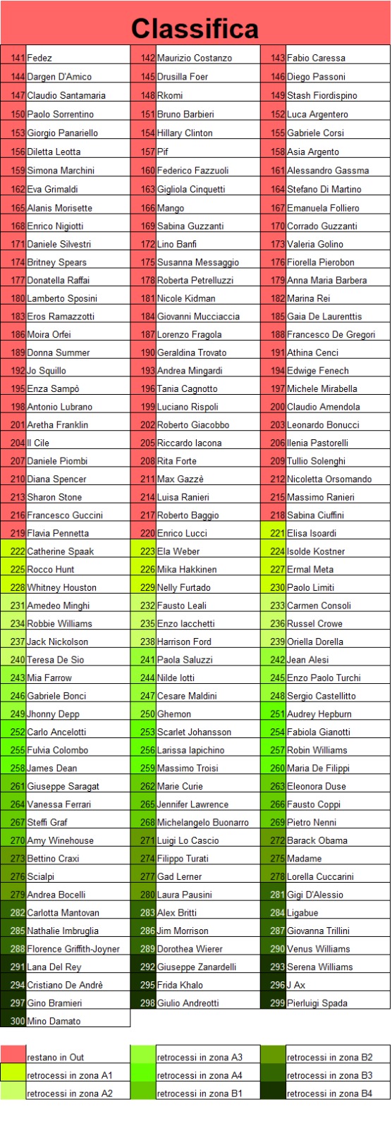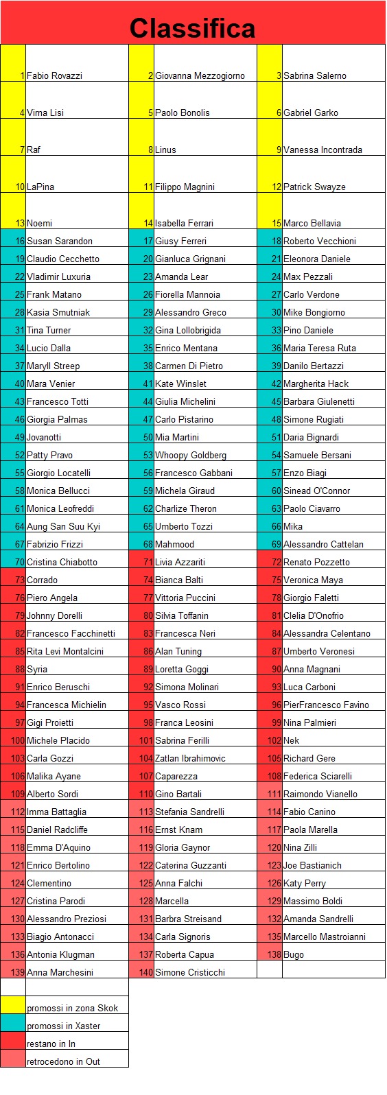 | superiore e vengono retrocessi i diecii personaggi con meno punteggio nel girone inferiore. Eccezione fanno le due estremità. Nell’ultimo girone vengono eliminati gli ultimi | ||||||