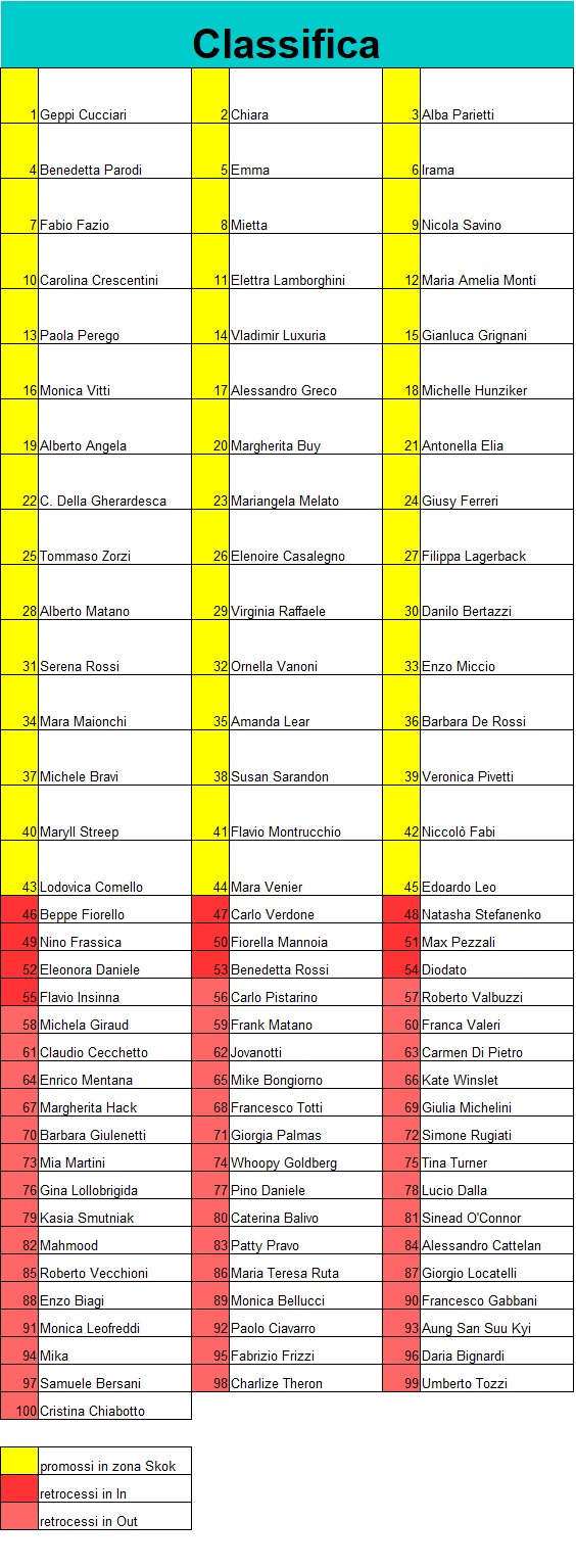 | Monica Vitti 13 | Franca Valeri 15 | Giusy Ferreri 13 | Margherita Hack 11 | Francesco Gabbani 11 |