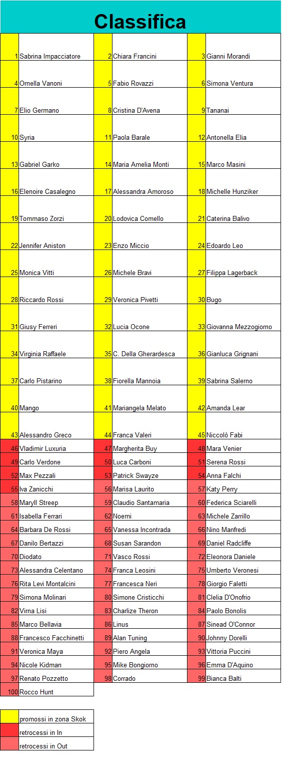 | classificati restano in zona Skok per l’edizione successiva; mentre tutti i classificati tra il 46° e il 100° posto vengono retrocessi in zona In&Out dell’edizione successiva. |