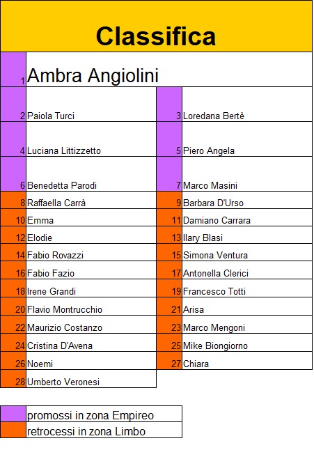 | I partecipanti sono 28. Sette sono retrocessi dalla zona Paradiso del ciclo precedente, mentre i restanti ventuno | |||||