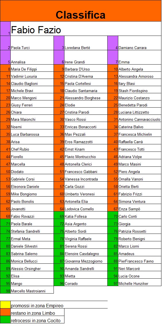 | I partecipanti sono 98. Trenta promossi dalla zona Cocito, quaranta provenienti dalla zona Limbo, ventuno retrocessi dalla | |||||