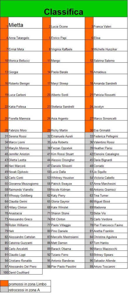 | Ermal Meta 82 | Virginia Raffaele 82 | Michelle Hunziker 81 | Monica Bellucci 81 | Mango 81 | Sabrina Salerno 80 |
