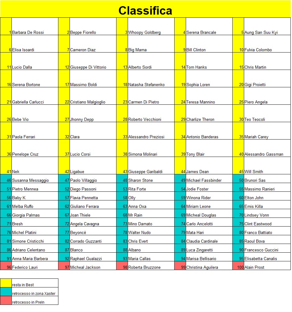 | l’85esimo posto vengono retrocessi nella zona Xaster del successivo ciclo e quelli tra 86esimo e il 100° posto vengono retrocessi in PreIn e PreOut. I primi quaranta classificati restano | |||||||||||