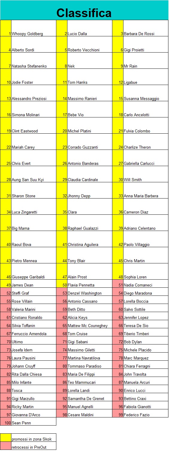 | inferiore di esimi o asterischi rispetto a quello che gli viene sottratto in base alla posizione raggiunta. Al suo posto viene eliminato il personaggio a lui superiore che non superi detta regola. Esimi e asterischi | ||||||