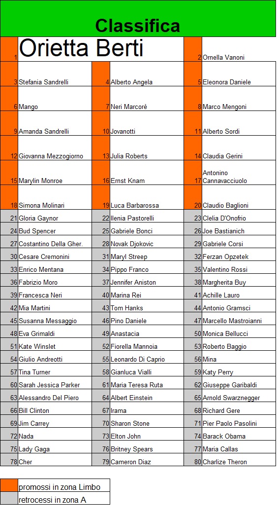 | (classifica in orizontale, il primo è il primo della prima colonna, l’ultimo è il sesto della quarta colonna) | |||||||