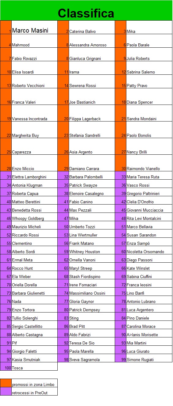 | promossi in zona Limbo | eliminati (31°/40° classificati) |