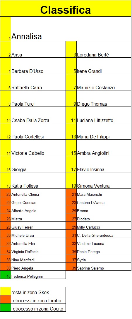 | retrocessi nella zona Limbo del successivo ciclo e l’ultimo in zona Cocito; mentre i primi diciannove classificati restano | ||||