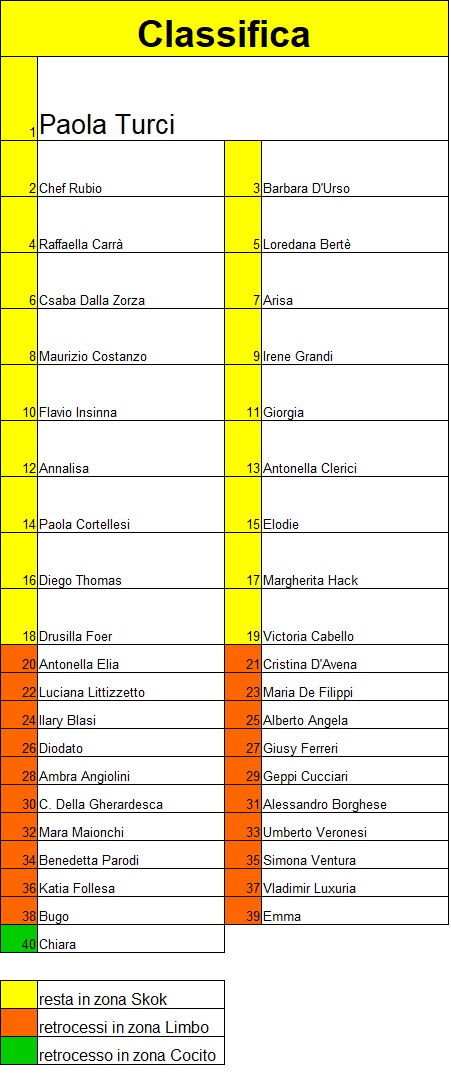 | retrocessi nella zona Limbo del successivo ciclo e l’ultimo in zona Cocito; mentre i primi diciannove classificati restano | ||||