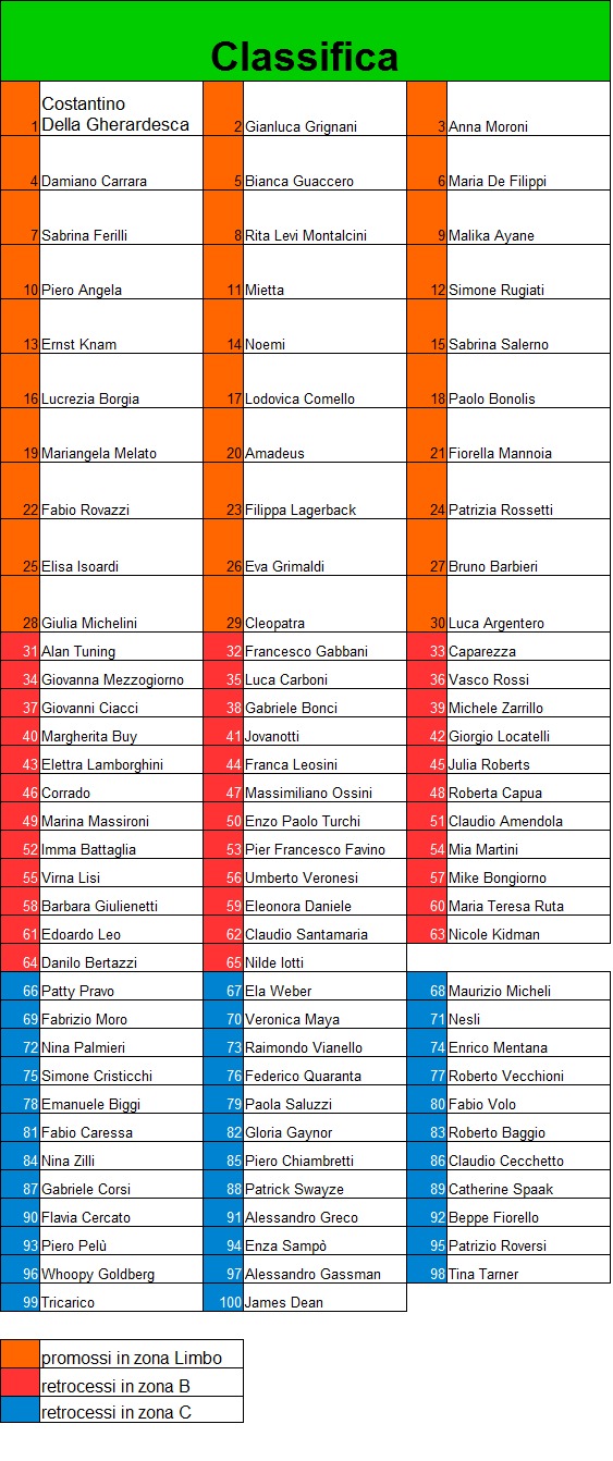 | I partecipanti ammessi alle selezioni sono 100. Ventinove retrocessi dalla zona Limbo, settanta promossi dalla zona A e l’ultimo classificato della zona Plus | |||||