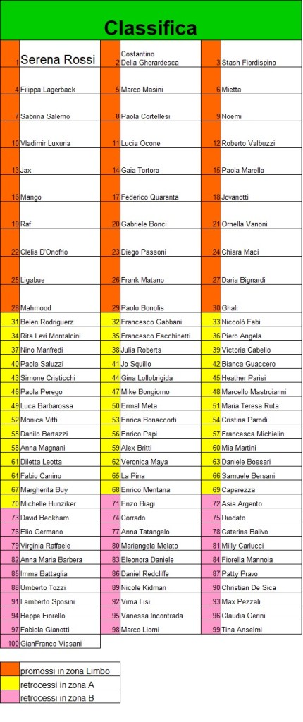 | classifica parziale a eliminazioni consumate. Vengono eliminati gli ultimi classificati e i quattro penultimi con punteggio peggiore. I cinquanta che superano | |||||