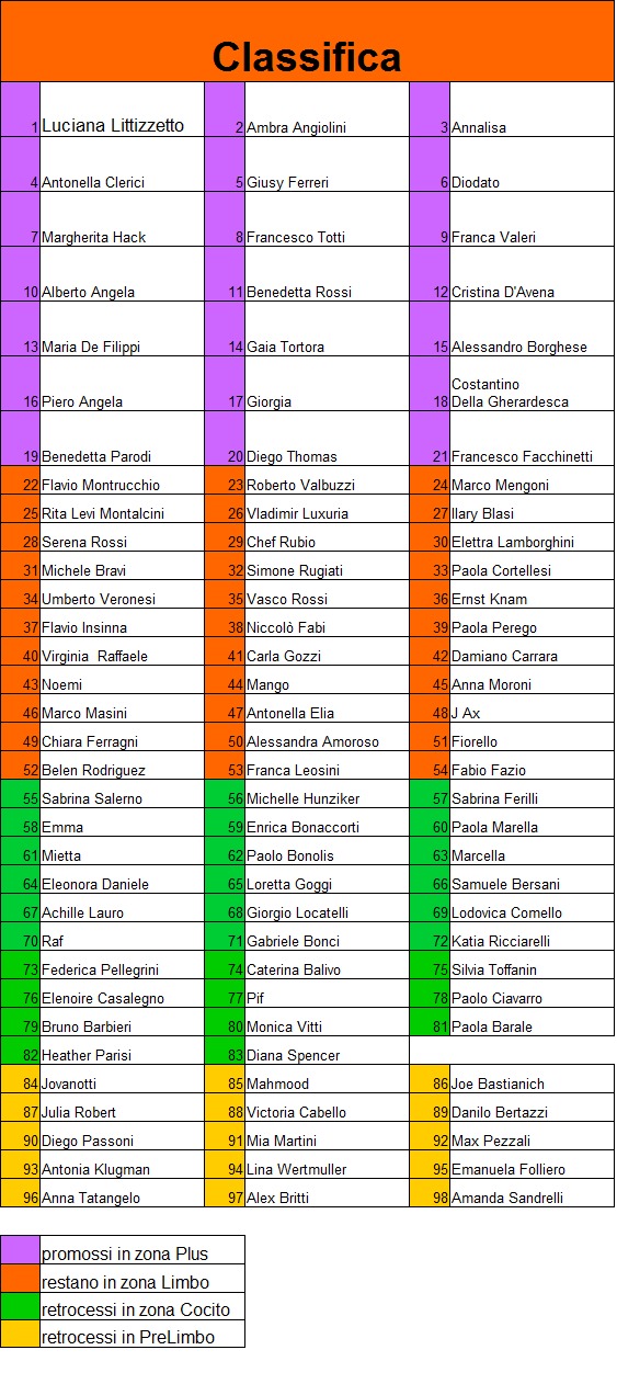 | retrocessi dalla zona Plus | promossi da zona Cocito | promossi da PreLimbo |