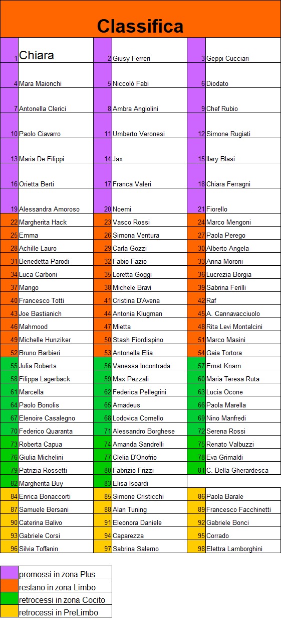 | Cristina D’Avena 10 | Antonia Klugman 10 | Ilary Blasi 10 | Francesco Totti 10 | Lucia Ocone 10 | Chiara 12 | J Ax 10 |