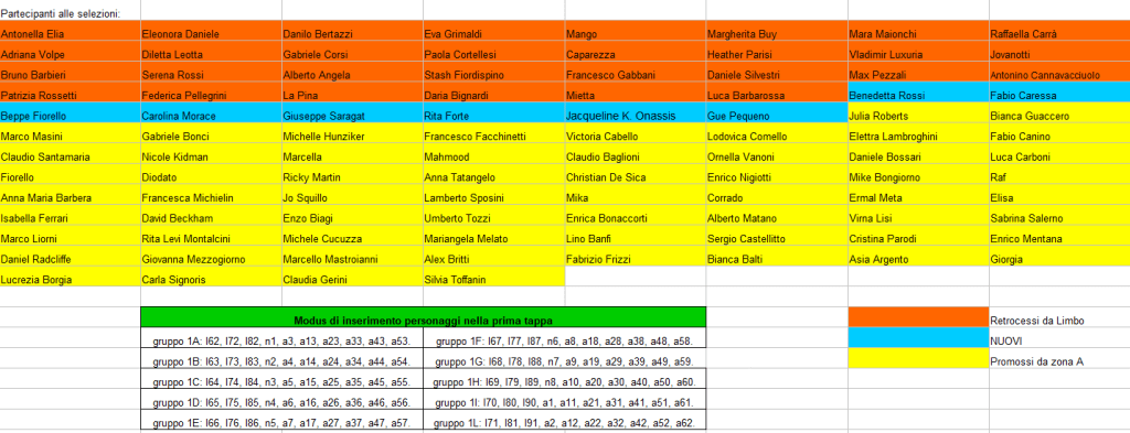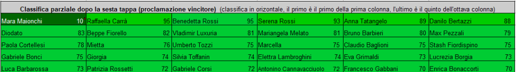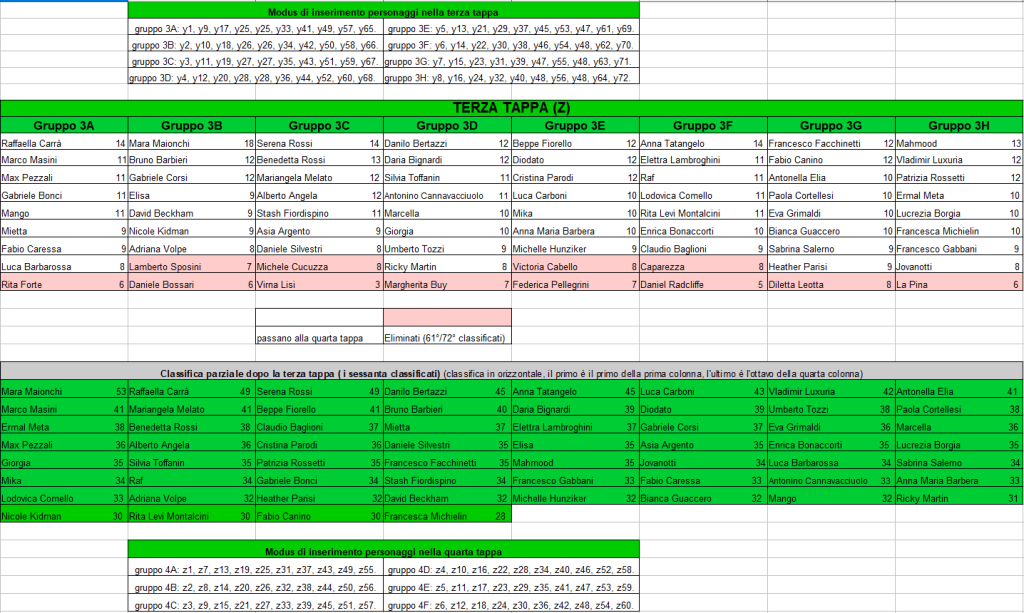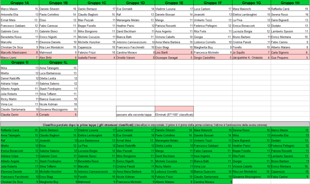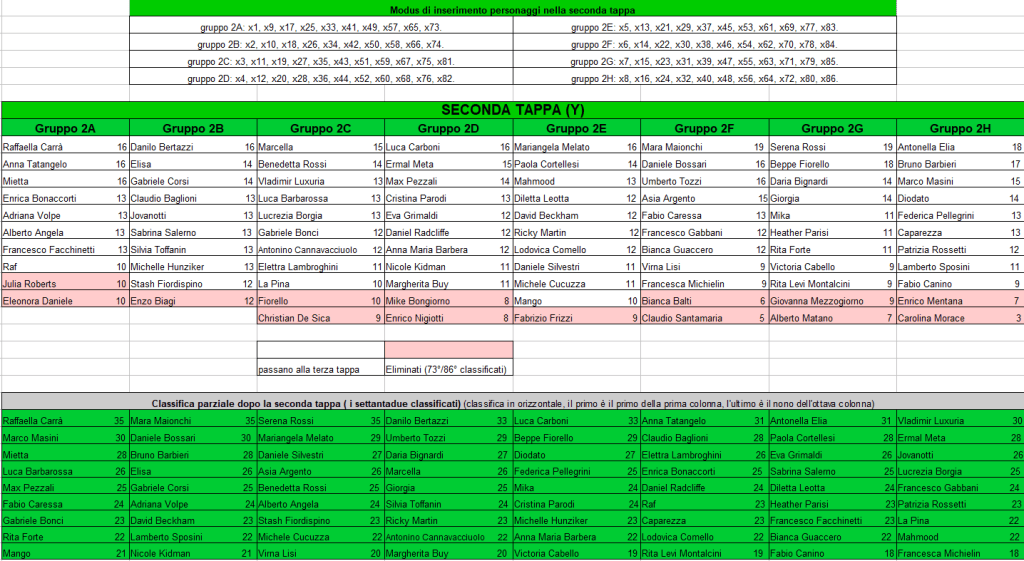 | alla seconda. Nella seconda tappa ci due gironi da dieci personaggi e sei gironi da undici. I punteggi nella seconda tappa non tengono conto di quanto | |||||