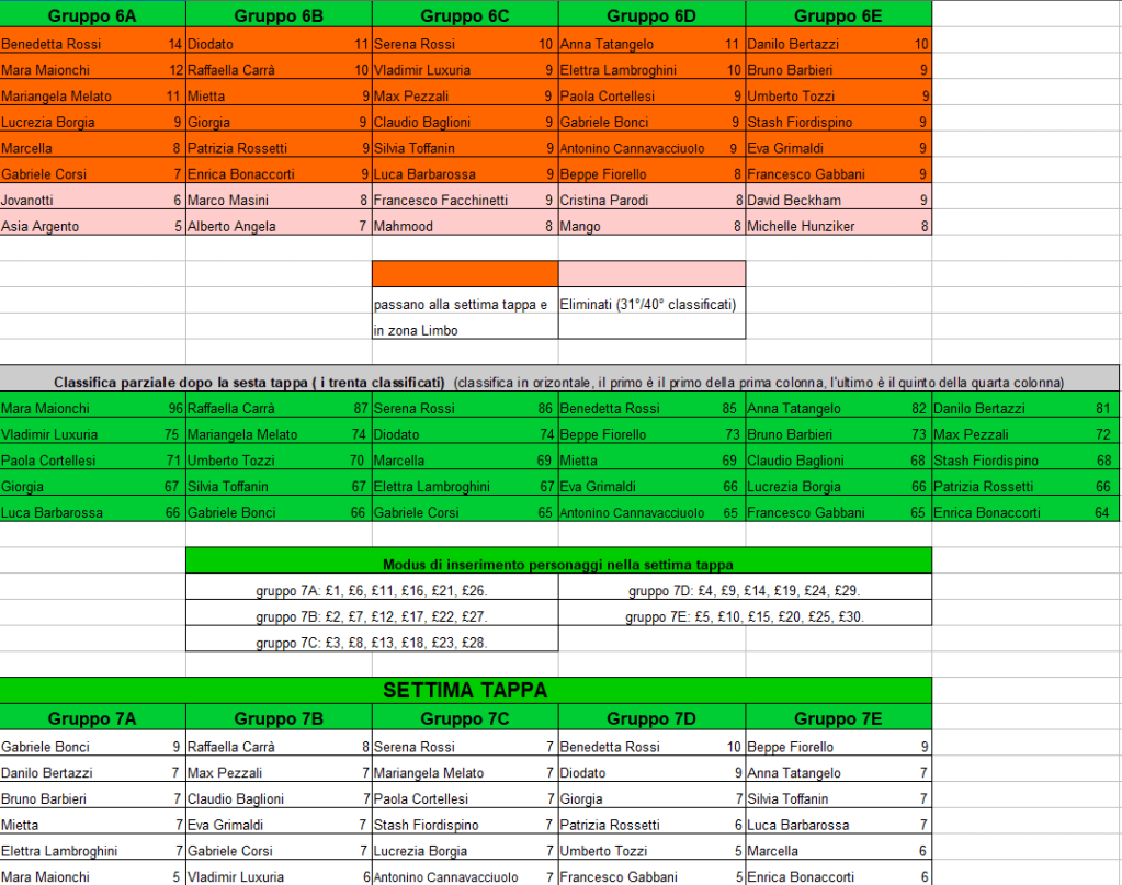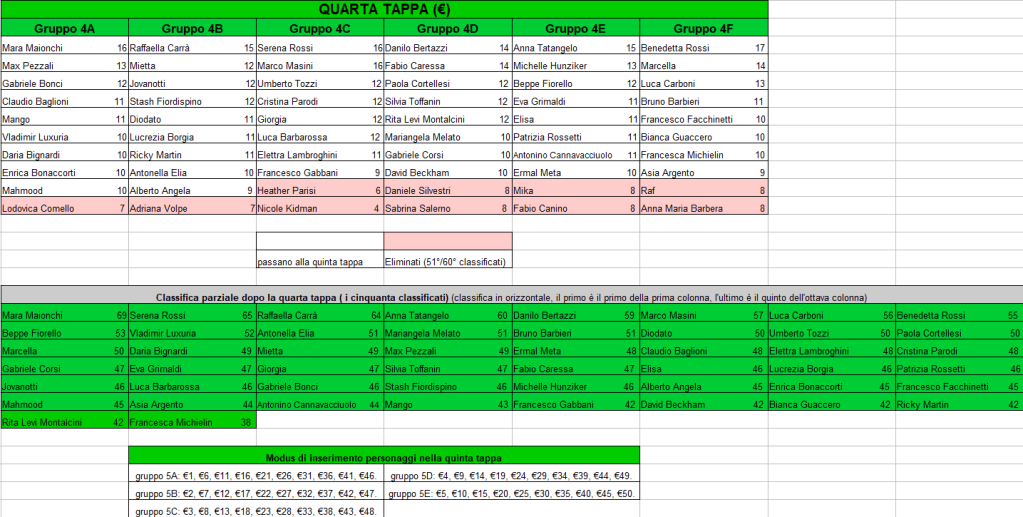 | ci sono sei gironi da dieci personaggi. I punteggi della quarta tappa non tengono conto di quanto successo nelle precedenti; salvo unire i punteggi nella | |||||