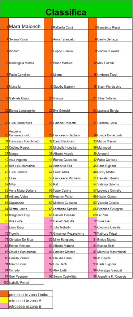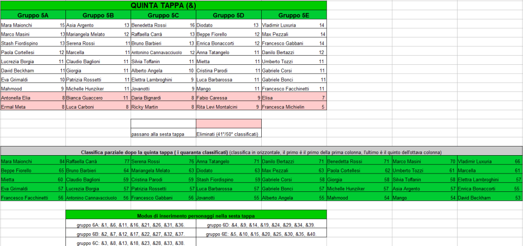 | la quarta tappa accedono alla quinta. Nella quinta tappa ci sono cinque gironi da dieci personaggi. I punteggi della quinta tappa non tengono conto di | |||||