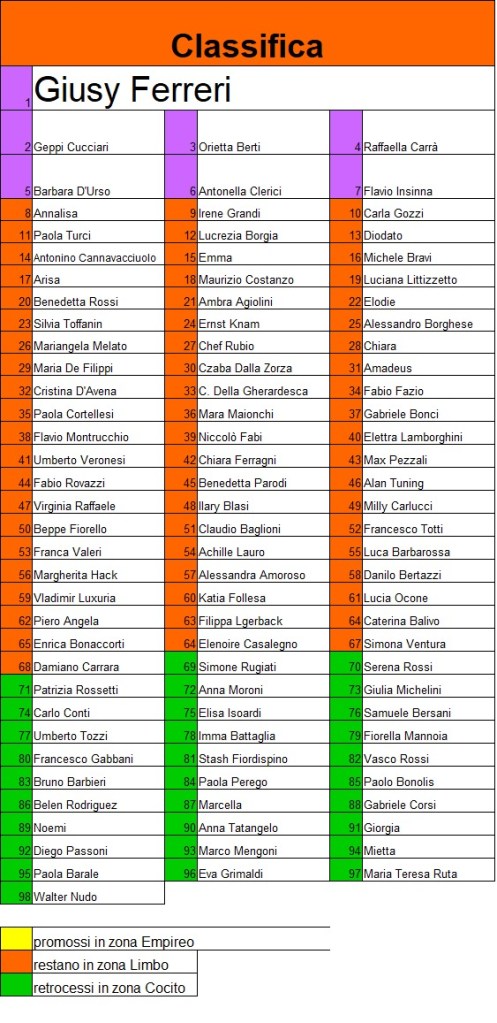 | I primi di ogni girone accedono alla zona Empireo di questa edizione. I secondi classificati di tutti i gironi vengono eliminati. |