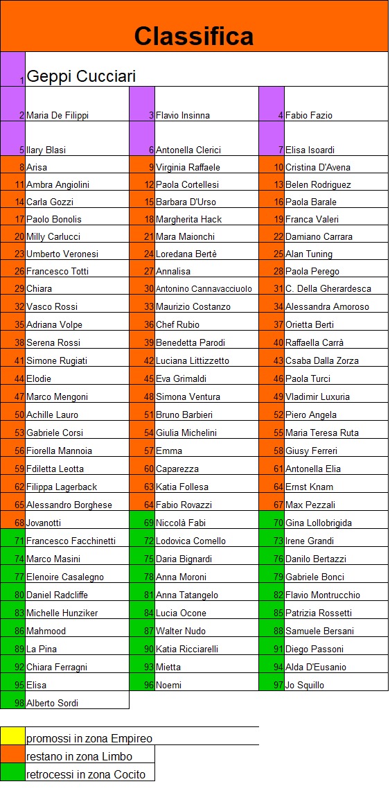 | Raffaella Carrà 14 | Barbara D’Urso 15 | Paolo Bonolis 15 | Orietta Berti 15 | Filippa Lagerback 15 | Vladimir Luxuria 15 | Alan Tuning 14 |